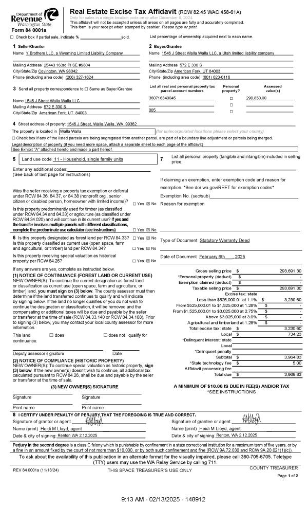 | 1 | 02/13/2025 | SWD | STATUTORY WARRANTY DEED | Y BROTHERS LLC | 1546 J STREET WALLA WALLA LLC | | | $293,691.00 | 148912 | 2025-00728 |