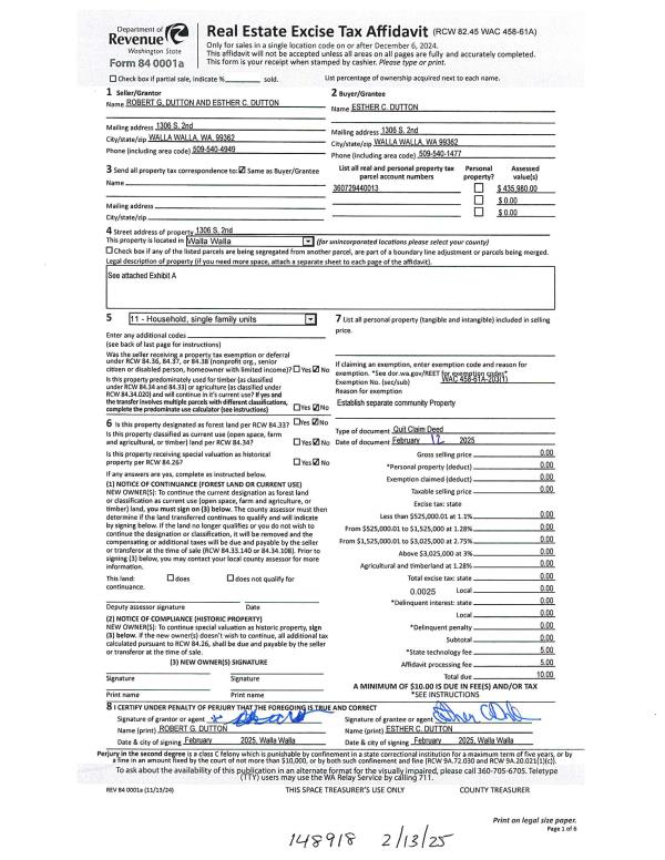 | 2 | 02/13/2025 | QCD | QUIT CLAIM DEED | DUTTON ROBERT G & ESTHER C | DUTTON ESTHER C | | | | 148918 | 2025-00754 |