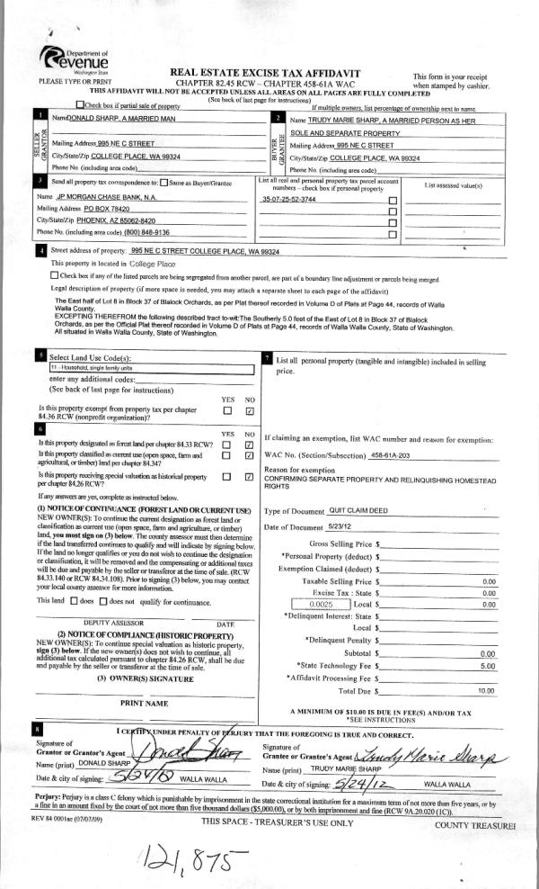 | 4 | 05/25/2012 | QCD | QUIT CLAIM DEED | SHARP, DONALD | SHARP, TRUDY MARIE | | | | 121875 | 2012-04316 |