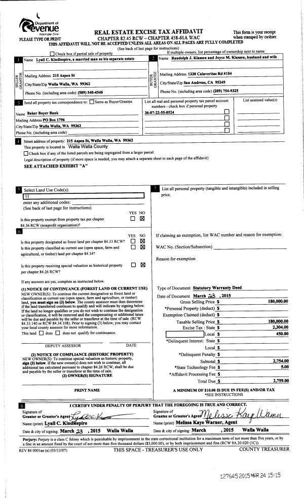 | 3 | 03/24/2015 | SWD | STATUTORY WARRANTY DEED | KINDLESPIRE LYALL C | KLASSEN RANDOLPH J & JOYCE M | | | $180,000.00 | 127645 | 2015-02407 |