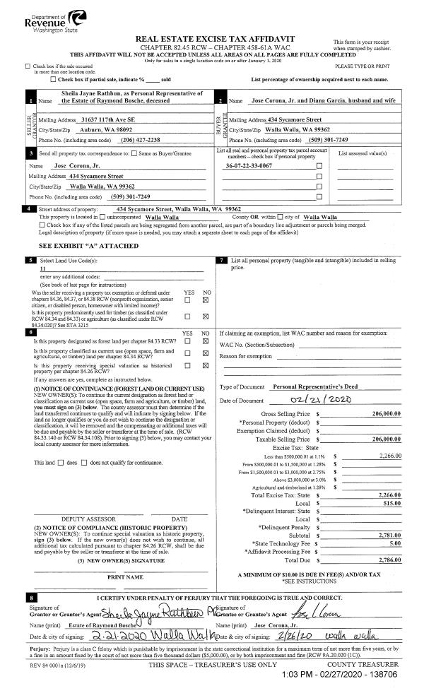 | 1 | 02/27/2020 | SWD | STATUTORY WARRANTY DEED | BOSCHE RAYMOND ESTATE OF | CORONA JOSE JR & DIANA GARCIA | | | $206,000.00 | 138706 | 2020-01825 |