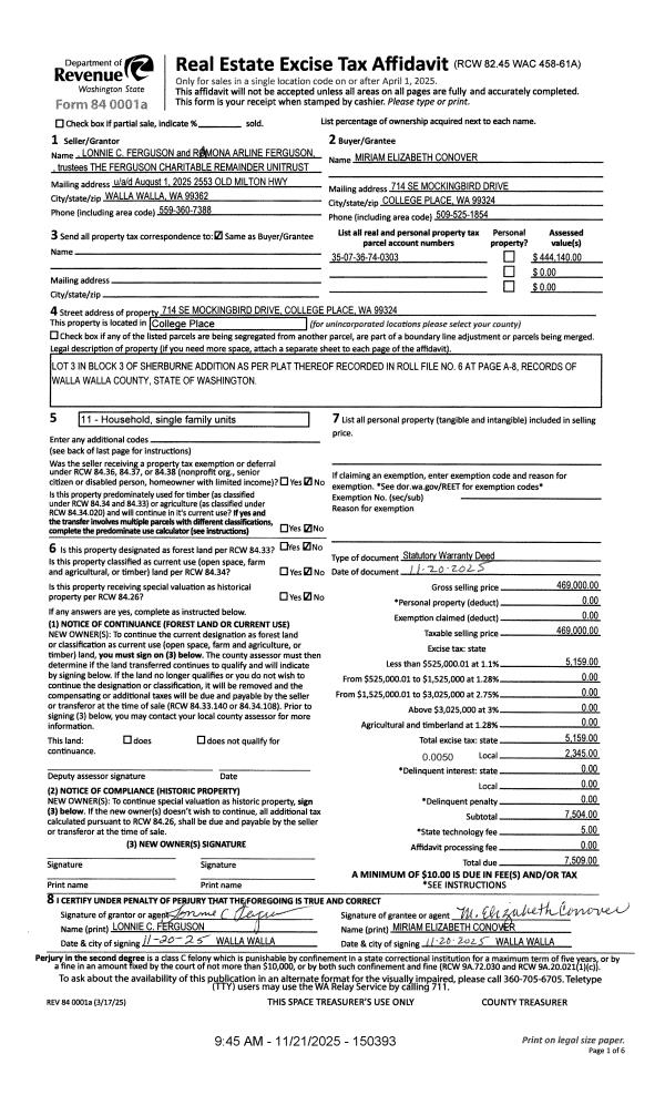 | 1 | 11/21/2025 | SWD | STATUTORY WARRANTY DEED | FERGUSON CHARITABLE REMAINDER UNITRUST | CONOVER MIRIAM ELIZABETH | | | $469,000.00 | 150393 | 2025-07213 |