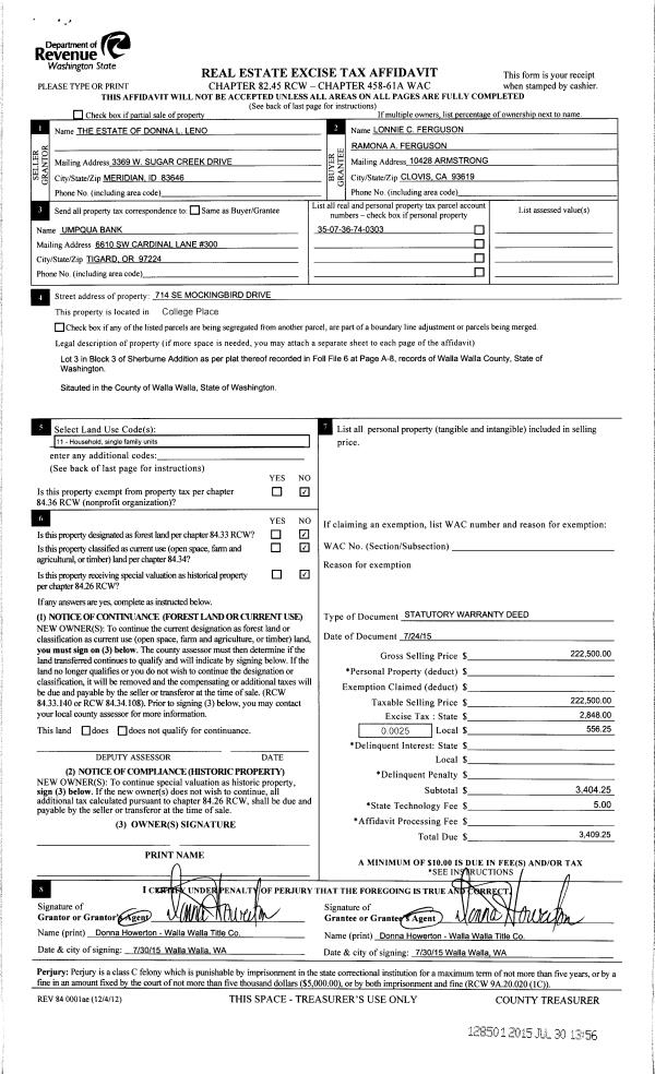 | 3 | 07/30/2015 | SWD | STATUTORY WARRANTY DEED | LENO DONNA L ESTATE OF | FERGUSON LONNIE C & RAMONA A | | | $222,500.00 | 128501 | 2015-06544 |