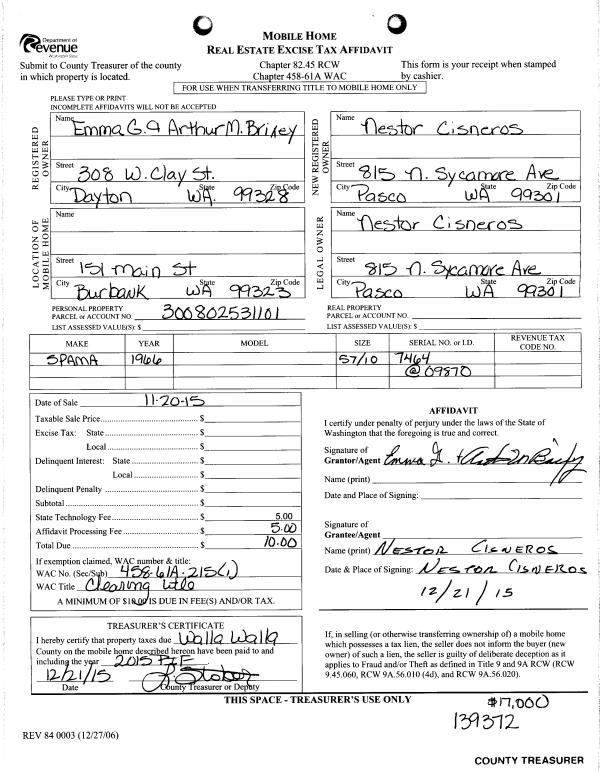 | 1 | 12/21/2015 | MH AFFIDAV | MOBILE HOME AFFIDAVIT | BRIXEY ARTHUR M & EMMA G | CISNEROS NESTOR | | | | 129372 | MHAFF-139372 |