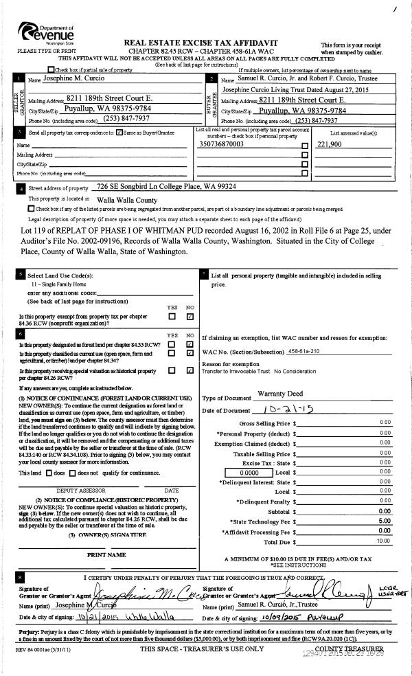 | 3 | 10/23/2015 | WARRANTY D | WARRANTY DEED | CURCIO MARY J | JOSEHPHINE CURCIO LIVING TRUST | | | $0.00 | 129401 | 2015-11002 |
