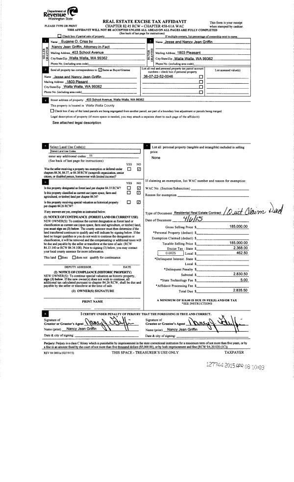 | 3 | 04/08/2015 | REAL ESTAT | REAL ESTATE CONTRACT | CRISS EUGENE OLIVER | CRISS EUGENE O LIFE ESTATE | | | $185,000.00 | 127744 | 2015-02854 |