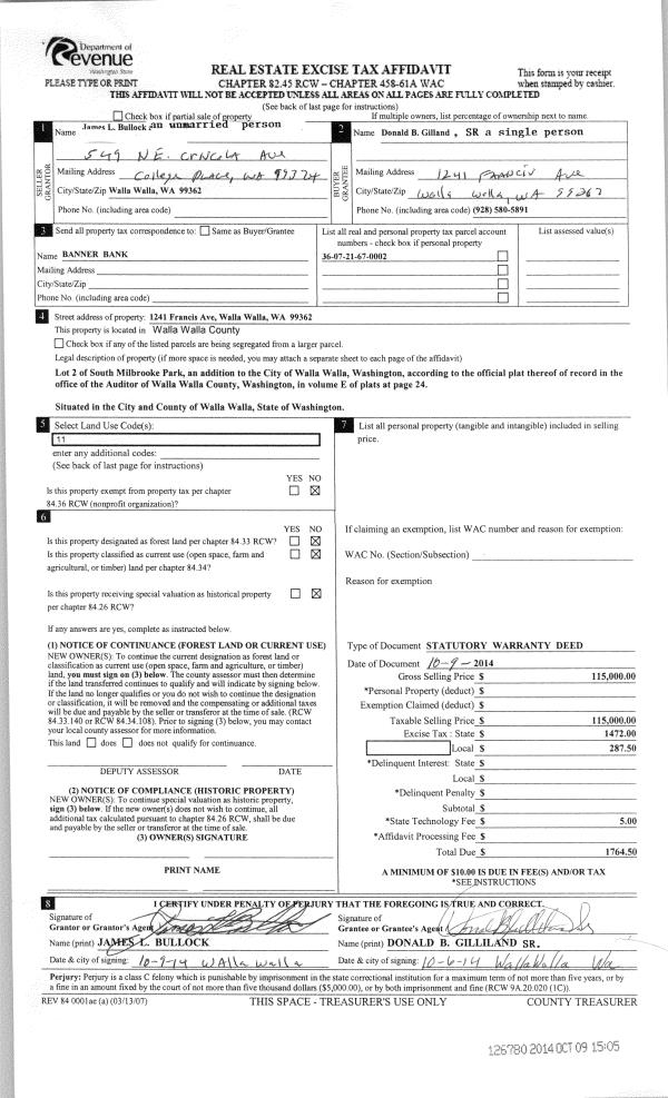 | 4 | 11/03/2014 | SWD | STATUTORY WARRANTY DEED | BULLOCK JAMES L | GILLILAND DONALD BILLIE ESTATE OF | | | $115,000.00 | 126780 | 2014-07438 |