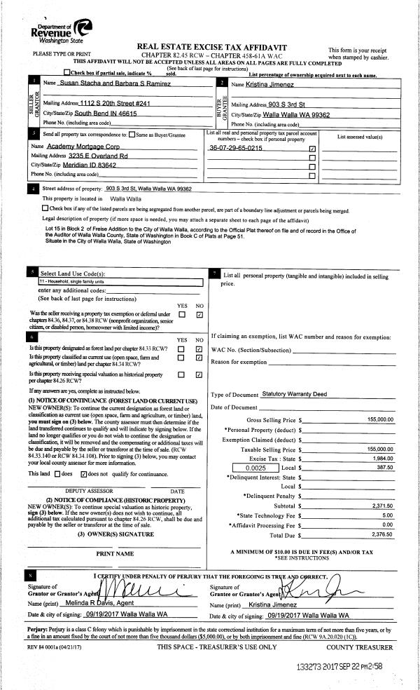 | 1 | 09/22/2017 | SWD | STATUTORY WARRANTY DEED | RAMIREZ BARBARA S LIFE ESTATE | JIMENEZ KRISTINA | | | $155,000.00 | 133273 | 2017-07502 |
