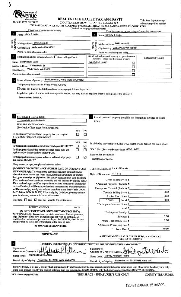 | 3 | 11/15/2016 | LOPA | LACK OF PROBATE AFFIDAVIT | KULJIS JACK A & BEVERLY J | KULJIS BEVERLY J | | | $0.00 | 131431 | 2016-09443 |