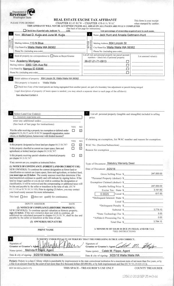 | 1 | 09/25/2018 | SWD | STATUTORY WARRANTY DEED | KULJIS MICHAEL D & JUNE M | HUNT JACK & ANGELA GETTMANN-HUNT | | | $247,000.00 | 135610 | 2018-07994 |