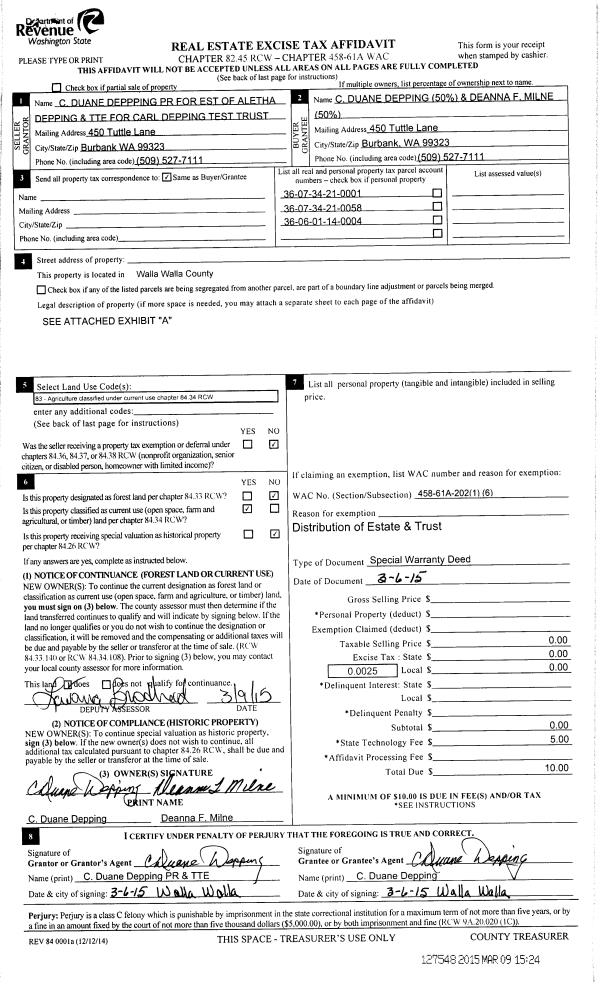 | 1 | 03/06/2015 | WARRANTY D | WARRANTY DEED | DEPPING CARL TRUST | DEPPING DUANE C | 3 PARCELS | | $0.00 | 127548 | 2015-01984 |
