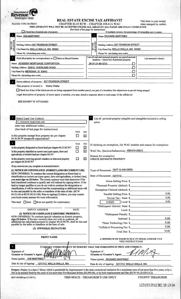 | 3 | 12/18/2012 | QCD | QUIT CLAIM DEED | MARTINEZ, KIM | MARTINEZ, RICHARD | | | $0.00 | 123193 | 2012-11283 |