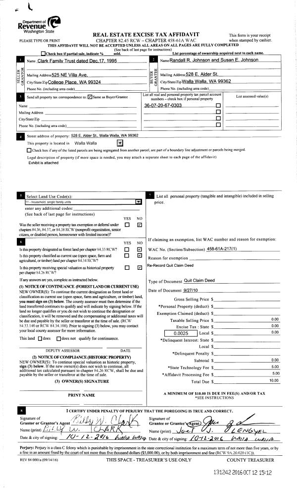 | 2 | 10/12/2016 | QCD | QUIT CLAIM DEED | CLARK FAMILY TRUST | JOHNSON RANDALL R & SUSAN E | | | | 131242 | 2016-08445 |