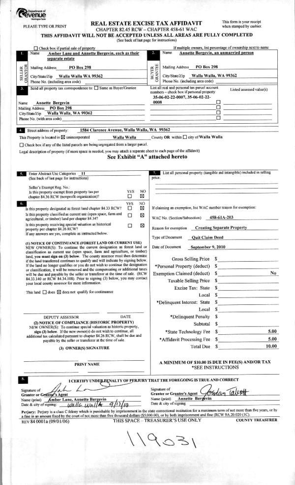| 2 | 09/20/2010 | QCD | QUIT CLAIM DEED | LANE AMBER | BERGEVIN ANNETTE | | | | 119031 | 2010-07414 |