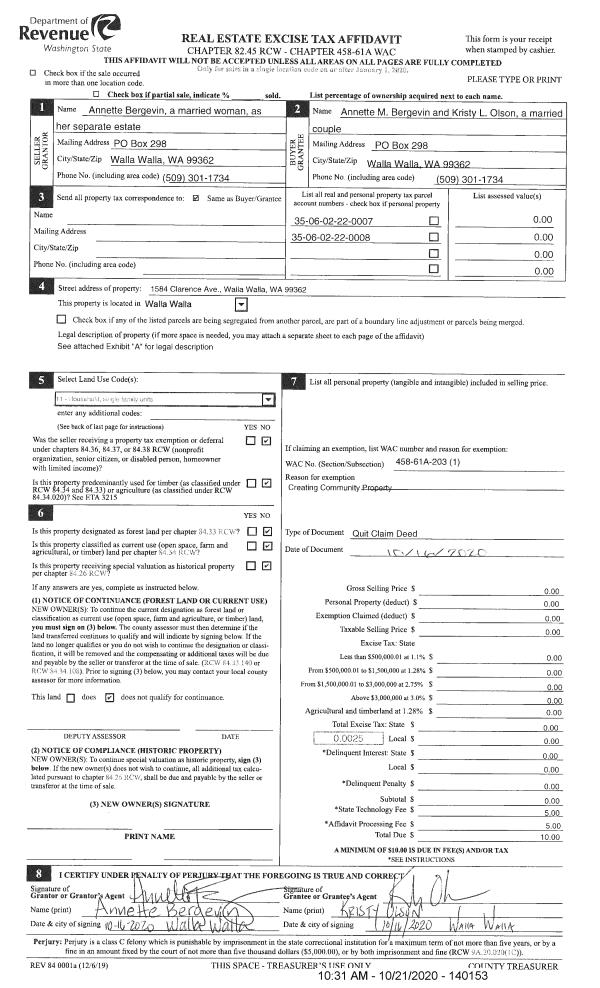 | 1 | 10/21/2020 | QCD | QUIT CLAIM DEED | BERGEVIN ANNETTE | BERGEVIN ANNETTE & KRISTY L OLSON | | | | 140153 | 2020-10924 |