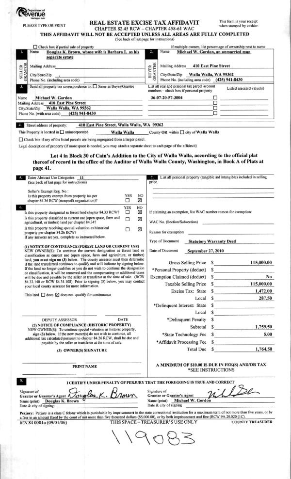 | 2 | 09/28/2010 | WARRANTY D | WARRANTY DEED | BROWN, DOUGLAS K & BARBARA I | GORDON, MICHAEL W | | | $115,000.00 | 119083 | 2010-07697 |