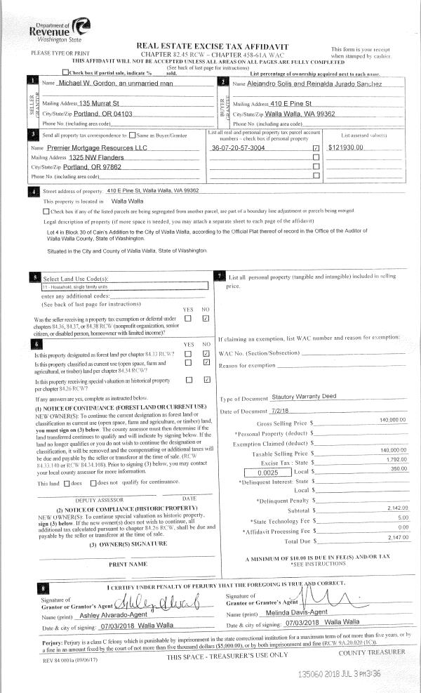 | Mailing Address: | REINALDA JURADO SANCHEZ 410 E PINE ST WALLA WALLA, WA 99362 | % Ownership: | 100.0000000000% |