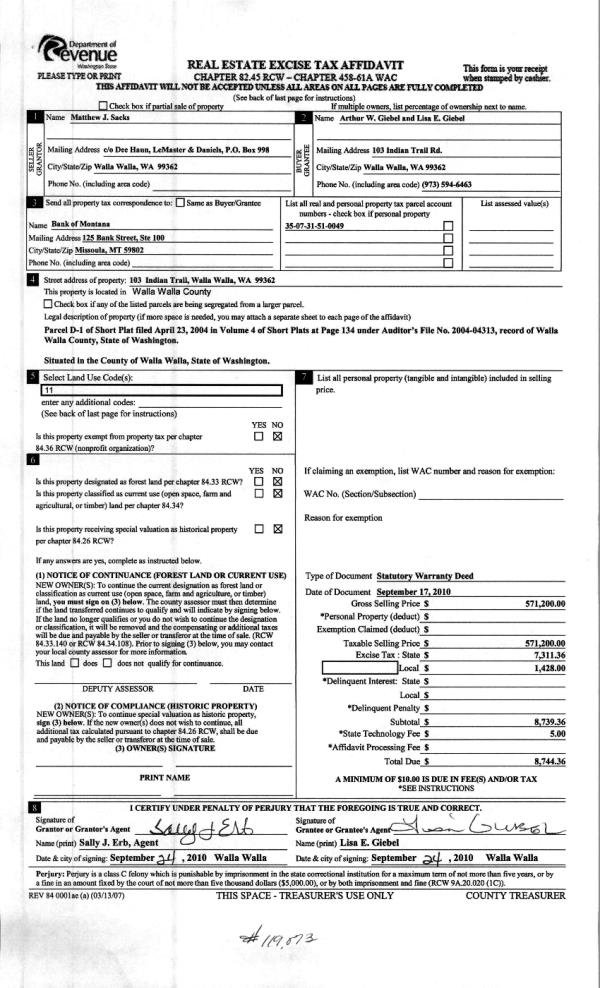 | 2 | 09/27/2010 | WARRANTY D | WARRANTY DEED | SACKS, MATTHEW J | GIEBEL, ARTHUR WALDON & LISA E | | | $571,200.00 | 119073 | 2010-07667 |