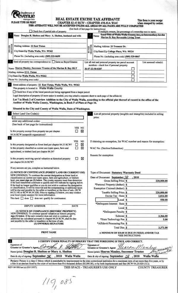| 3 | 09/29/2010 | WARRANTY D | WARRANTY DEED | SHELTON, DOUGLAS R & MARY A | RAY, MARIAN B REVOCABLE LIVING | | | $220,000.00 | 119085 | 2010-07701 |