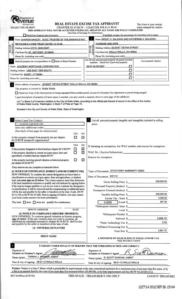 | 2 | 09/26/2012 | WARRANTY D | WARRANTY DEED | RAY, MARIAN B ESTATE OF | BALDWIN, BRENT O & KATHERINE A | | | $239,000.00 | 122714 | 2012-08447 |