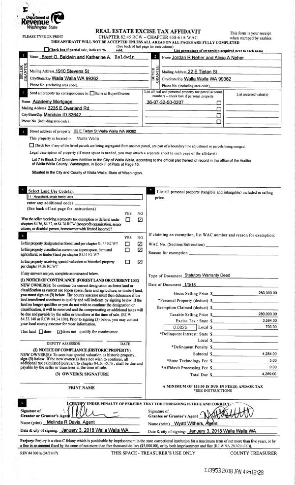| 1 | 01/04/2018 | SWD | STATUTORY WARRANTY DEED | BALDWIN BRENT O & KATHERINE A | NEHER JORDAN R & ALICIA A | | | $280,000.00 | 133953 | 2017-00122 |