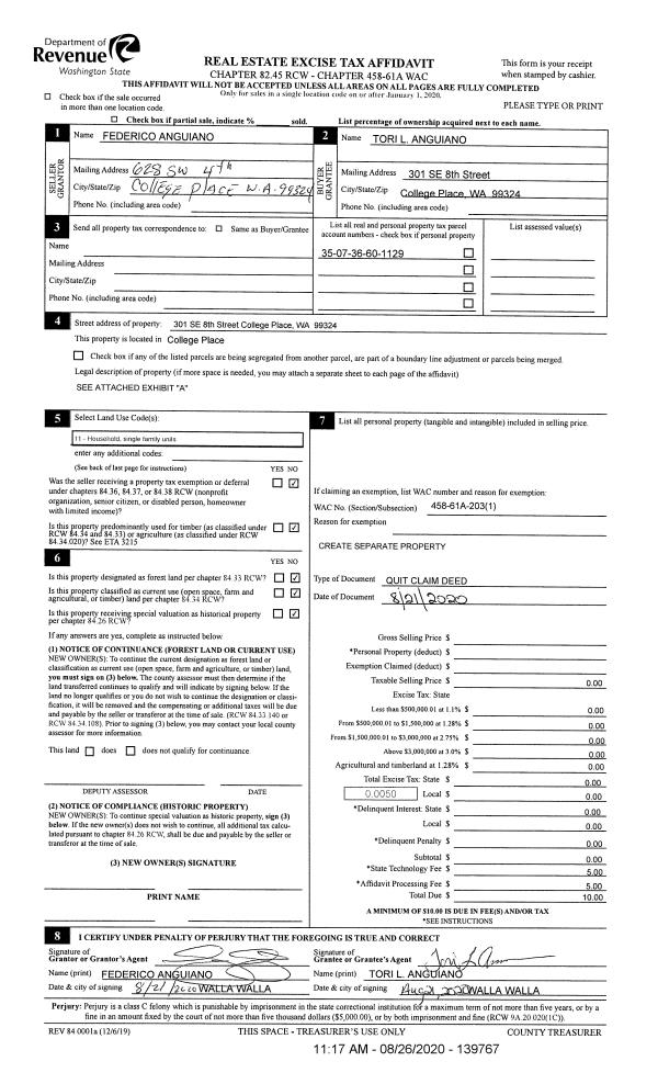 | 1 | 08/26/2020 | QCD | QUIT CLAIM DEED | ANGUIANO FEDERICO & TORI L | ANGUIANO TORI L | | | | 139767 | 2020-08546 |