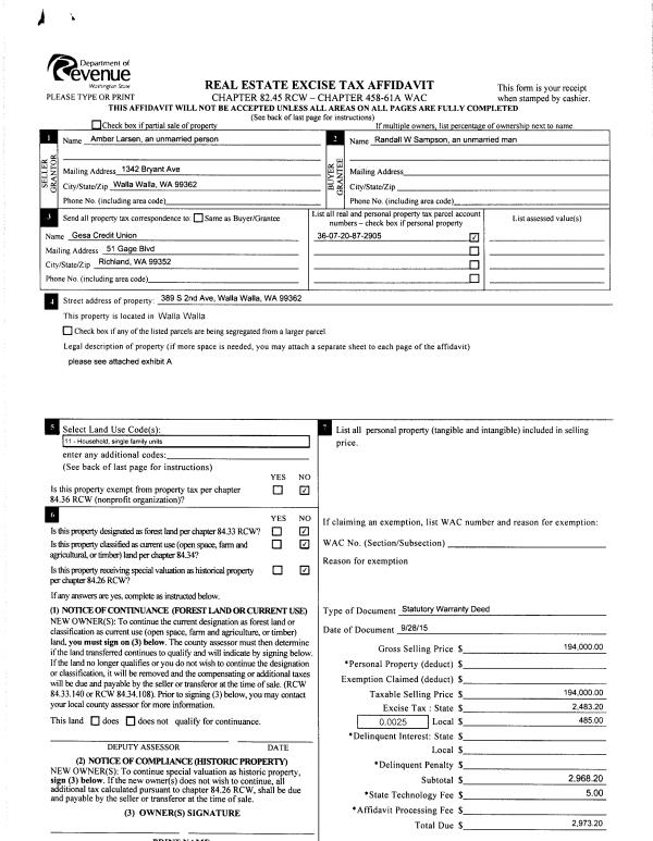 | 2 | 09/30/2015 | SWD | STATUTORY WARRANTY DEED | LARSEN AMBER | SAMPSON RANDALL W | | | $194,000.00 | 128913 | 2015-08594 |