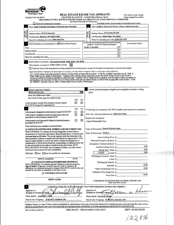 | 2 | 10/26/2012 | WARRANTY D | WARRANTY DEED | UPPER COLUMBIA CORP OF SDA | CLOSE, JERALD A & THORA L | | | $0.00 | 122876 | 2012-09441 |