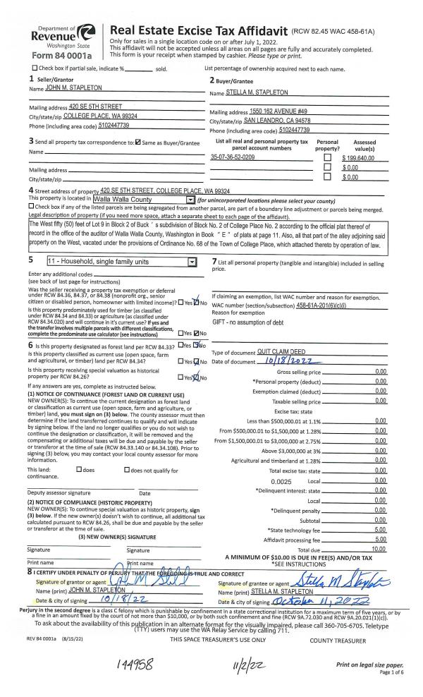 | 1 | 10/18/2022 | QCD | QUIT CLAIM DEED | STAPLETON JOHN M | STAPLETON STELLA M | | | $0.00 | 144958 | 2022-08896 |