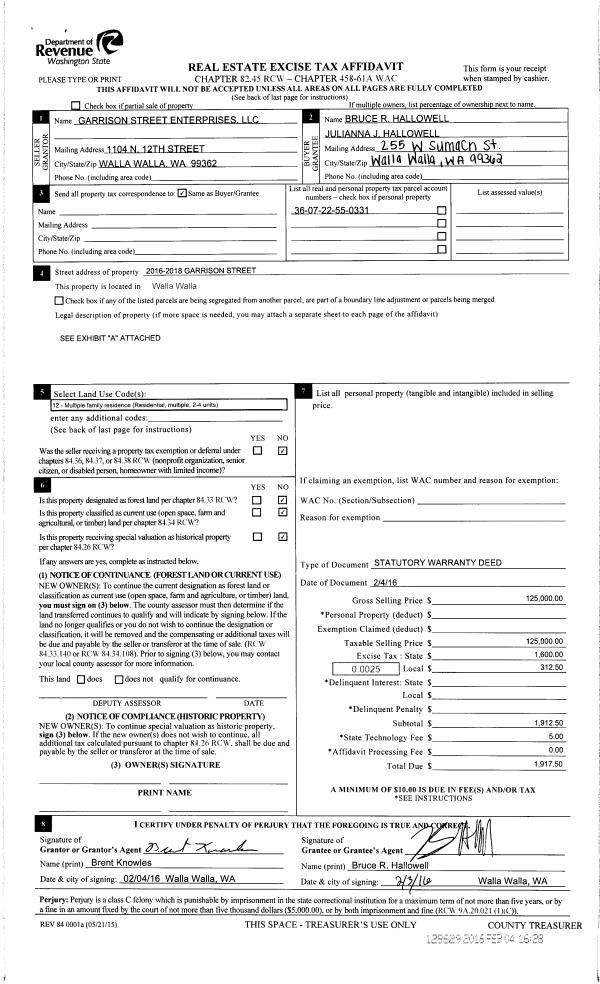 | 2 | 02/04/2016 | SWD | STATUTORY WARRANTY DEED | GARRISON STREET ENTERPRISES LLC | HALLOWELL BRUCE R & JULIANNA J | | | $125,000.00 | 129629 | 2016-00885 |