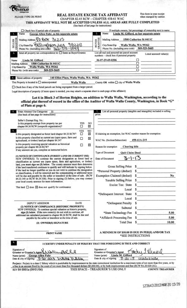 | 3 | 03/20/2013 | QCD | QUIT CLAIM DEED | FUHR, GEORGE ALLEN | GIFFORD, LINDA M | | | $0.00 | 123643 | 2013-02644 |