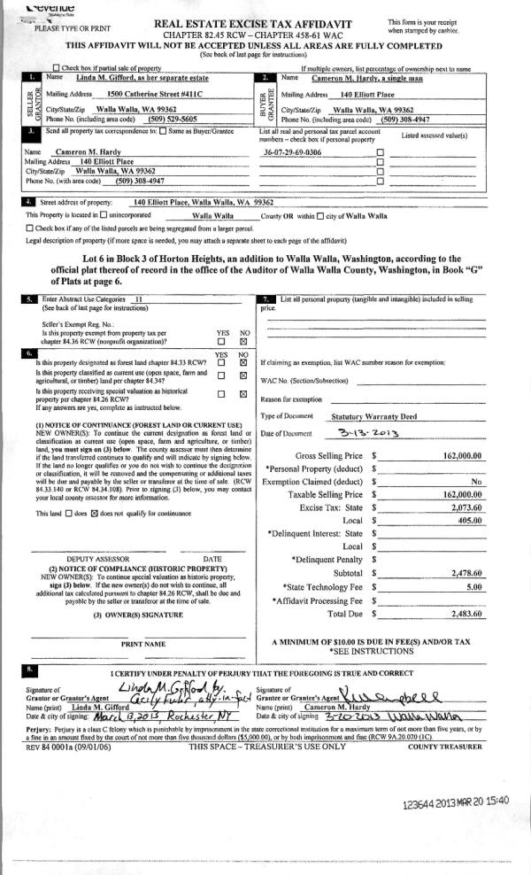 | 4 | 03/20/2013 | WARRANTY D | WARRANTY DEED | GIFFORD, LINDA M | HARDY, CAMERON M | | | $162,000.00 | 123644 | 2013-02645 |