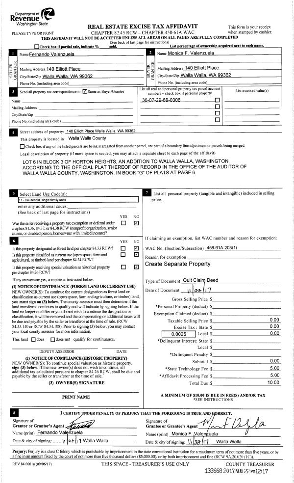 | 1 | 11/22/2017 | QCD | QUIT CLAIM DEED | VALENZUELA FERNANDO | VALENZUELA MONICA F | | | | 133668 | 2017-09427 |