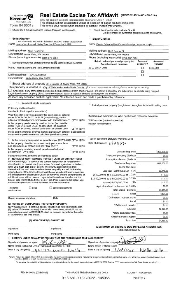 | 1 | 11/29/2022 | SWD | STATUTORY WARRANTY DEED | SCHREINDL LIVING TRUST | OCHOA FABIOLA & ISAI CAMONA MADRIGAL | | | $359,000.00 | 145066 | 2022-09388 |