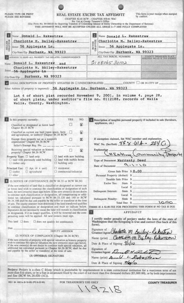 | 4 | 09/30/2010 | WARRANTY D | WARRANTY DEED | NORTHWEST TRUSTEE SERVICES INC | WELLS FARGO BANK NA | | | $135,434.00 | 119102 | 2010-07780 |