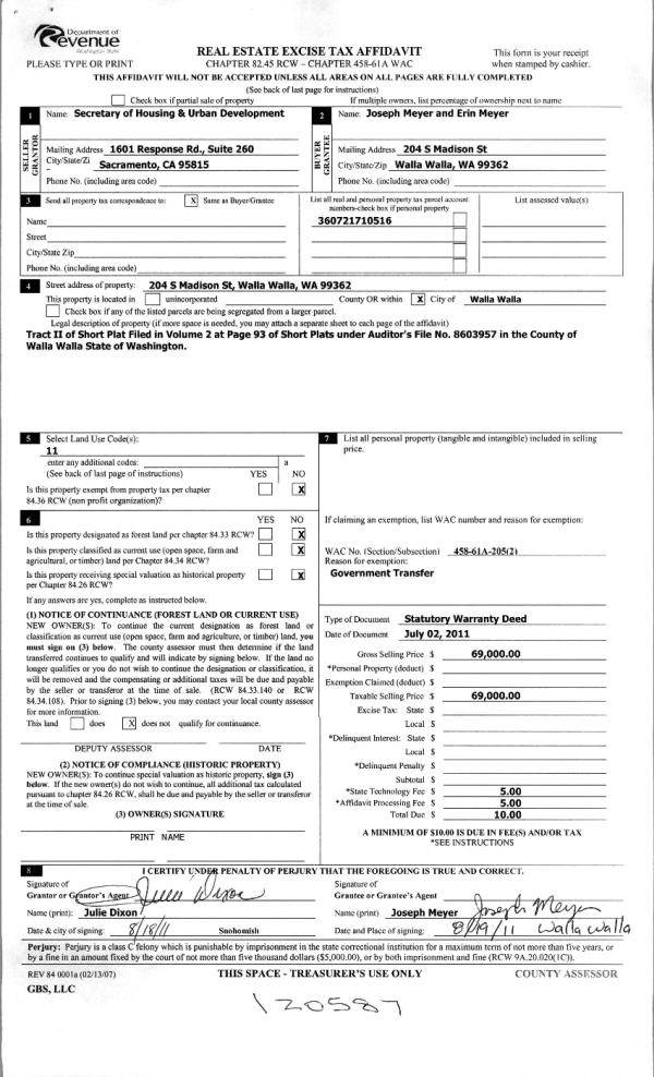 | 2 | 08/23/2011 | WARRANTY D | WARRANTY DEED | SECRETARY OF HOUSING & URBAN D | MEYER, JOSEPH & ERIN | | | $69,000.00 | 120587 | 2011-06601 |