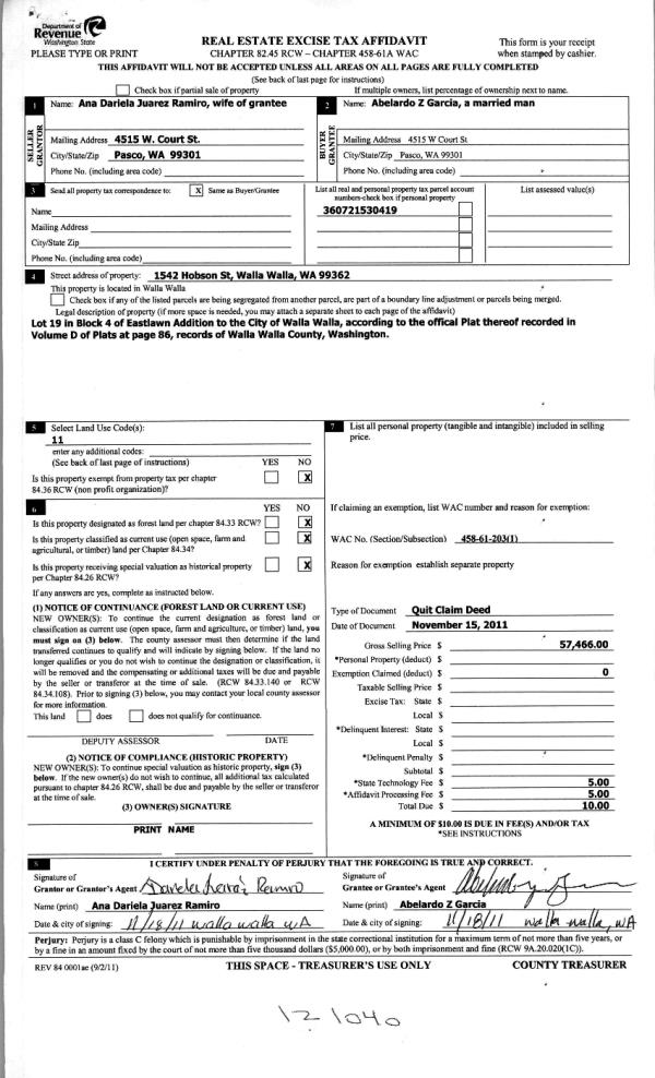 | 2 | 11/23/2011 | QCD | QUIT CLAIM DEED | ANA DARIELA JUAREZ RAMIRO | GARCIA, ABELARDO Z | | | $57,466.00 | 121040 | 2011-09244 |