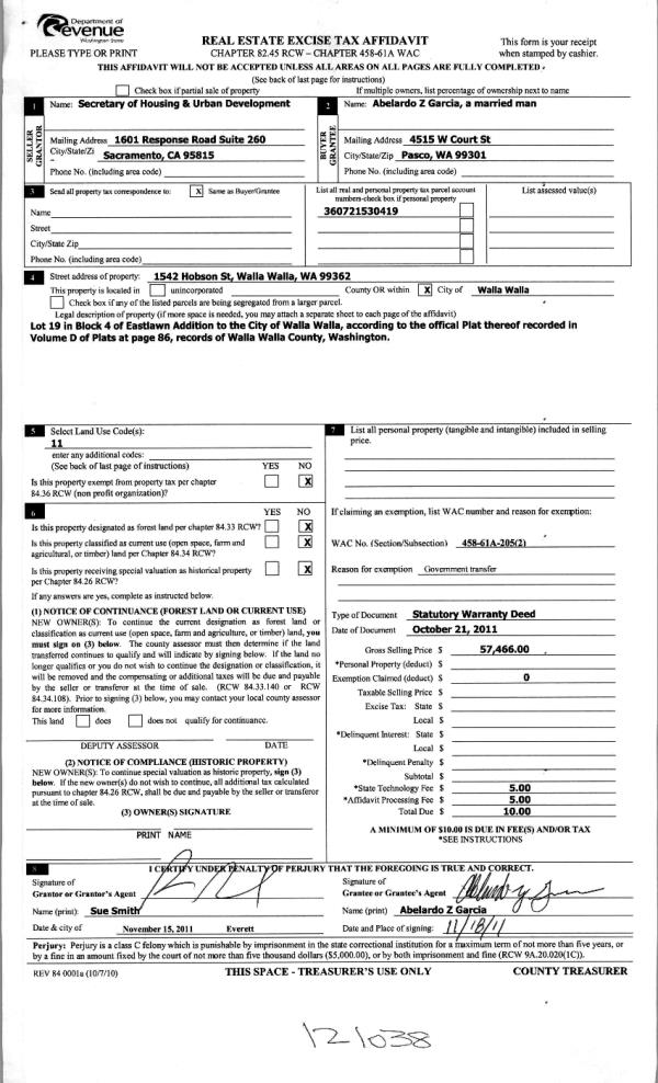 | 3 | 11/23/2011 | WARRANTY D | WARRANTY DEED | SECRETARY OF HOUSING & URBAN D | GARCIA, ABELARDO Z | | | $57,466.00 | 121038 | 2011-09241 |