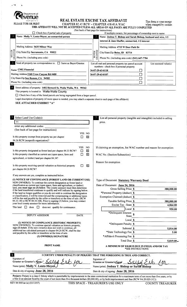 | 4 | 07/01/2016 | SWD | STATUTORY WARRANTY DEED | MEYER MOLLY V | BISHOP JOSHUA T & SARAH | | 2-PARCELS | $380,000.00 | 130550 | 2016-05114 |