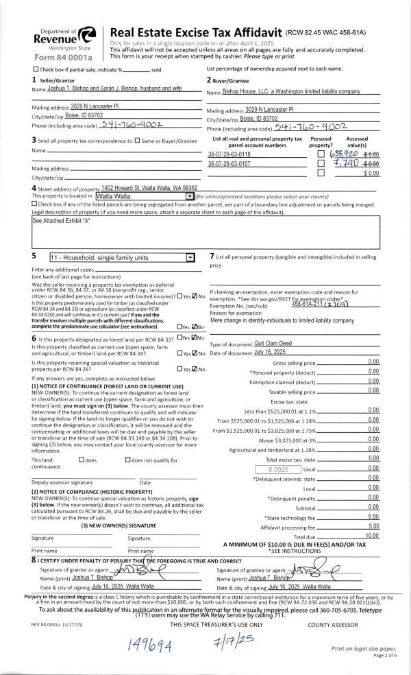 | 1 | 07/17/2025 | QCD | QUIT CLAIM DEED | BISHOP SARAH JANE & JOSHUA TODD | BISHOP HOUSE LLC | | | | 149694 | 2025-04099 |