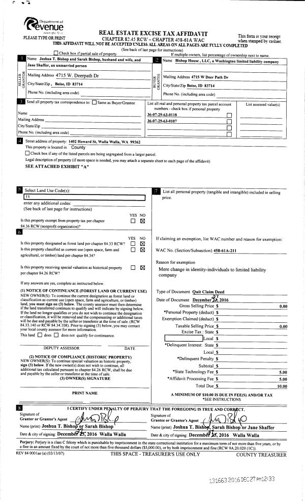 | 3 | 12/27/2016 | QCD | QUIT CLAIM DEED | BISHOP JOSHUA T & SARAH | BISHOP HOUSE LLC | | 2 PARCELS | $0.00 | 131663 | 2016-10657 |