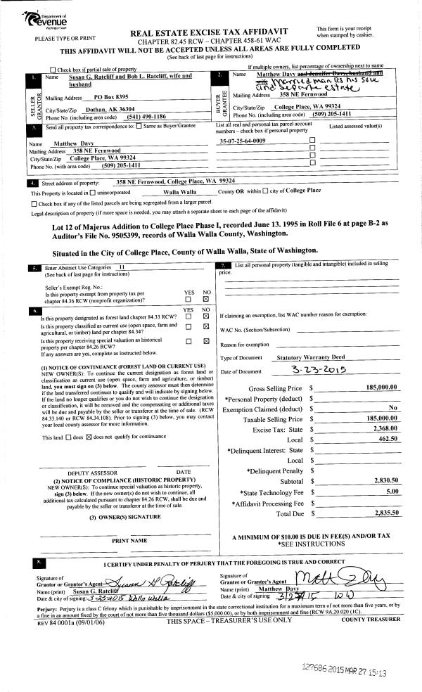 | 3 | 03/23/2015 | SWD | STATUTORY WARRANTY DEED | RATCLIFF BOB L & SUSAN G | DAVY MATTHEW | | | | 127859 | 2015-03504 |