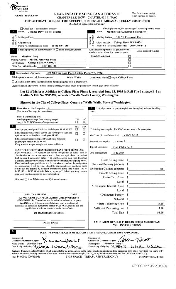 | 4 | 03/27/2015 | QCD | QUIT CLAIM DEED | DAVY JENNIFER | DAVY MATTHEW | | | | 127687 | 2015-02551 |