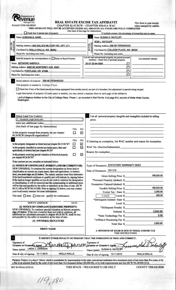 | 6 | 10/14/2010 | WARRANTY D | WARRANTY DEED | HARE, GORDON B | RATCLIFF, BOB L & SUSAN G | | | $186,000.00 | 119180 | 2010-08258 |