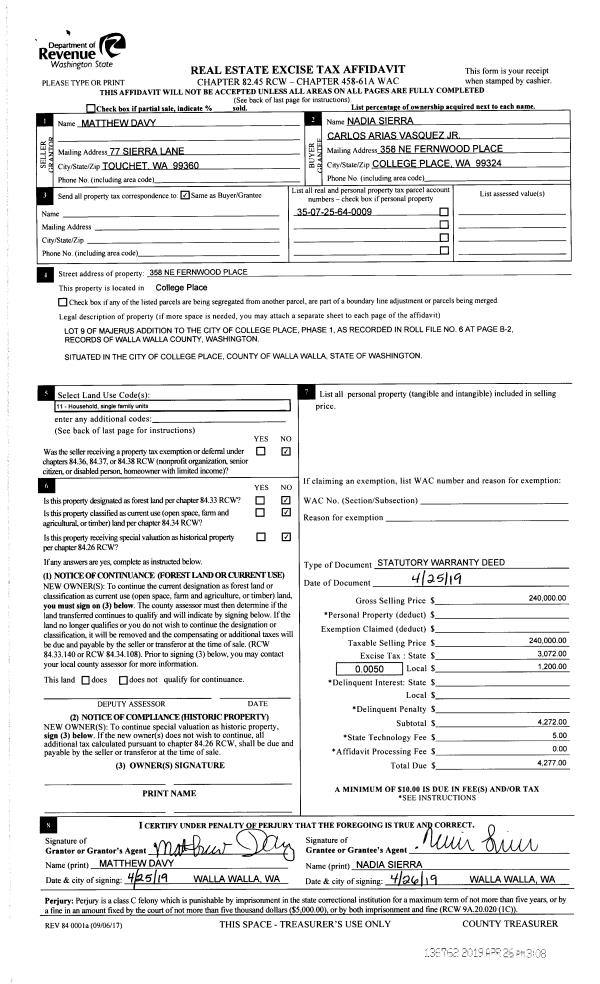 | 1 | 04/26/2019 | SWD | STATUTORY WARRANTY DEED | DAVY MATTHEW | SIERRA NADIA | | | $240,000.00 | 136762 | 2019-02671 |