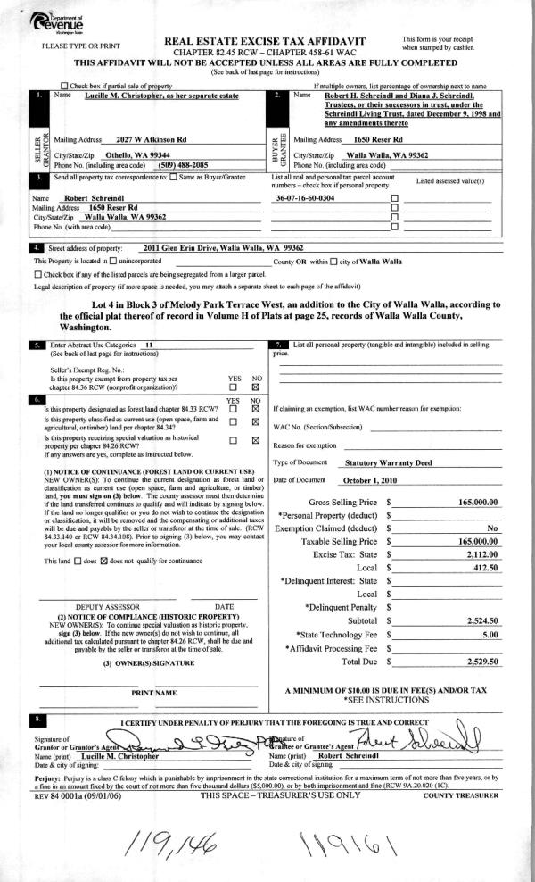 | 2 | 10/08/2010 | WARRANTY D | WARRANTY DEED | CHRISTOPHER, LUCILLE | SCHREINDL, ROBERT H & DIANA J | | | $165,000.00 | 119161 | 2010-08056 |