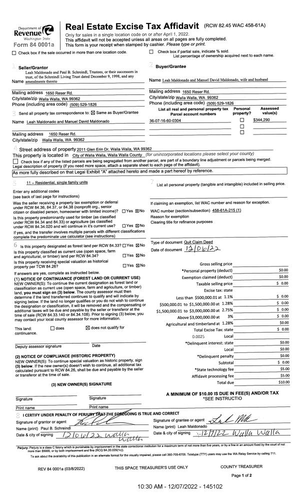 | 1 | 12/06/2022 | QCD | QUIT CLAIM DEED | SCHREINDL LIVING TRUST | MALDONADO LEAH & MANUEL DAVID | | | $0.00 | 145102 | 2022-09557 |