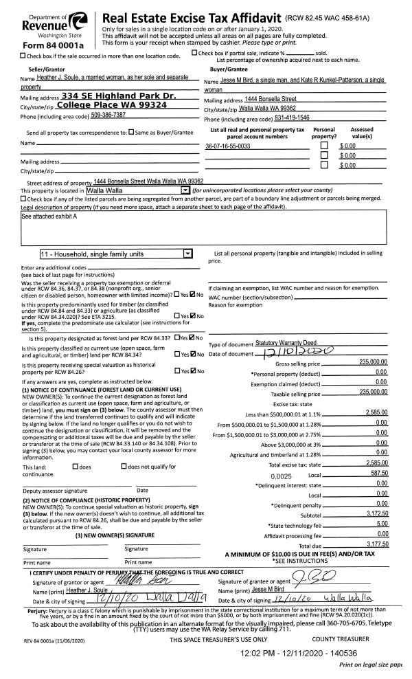 | 1 | 12/11/2020 | SWD | STATUTORY WARRANTY DEED | SOULE HEATHER J | BIRD JESSE M | | | $235,000.00 | 140536 | 2020-13156 |