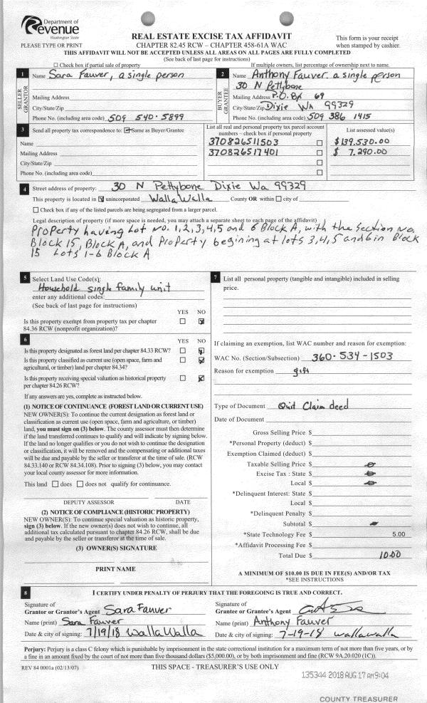 | 2 | 06/13/2014 | EASE | EASEMENT | FAUVER ANTHONY | WALLA WALLA COUNTY OF | | | | 126066 | 2014-04087 |