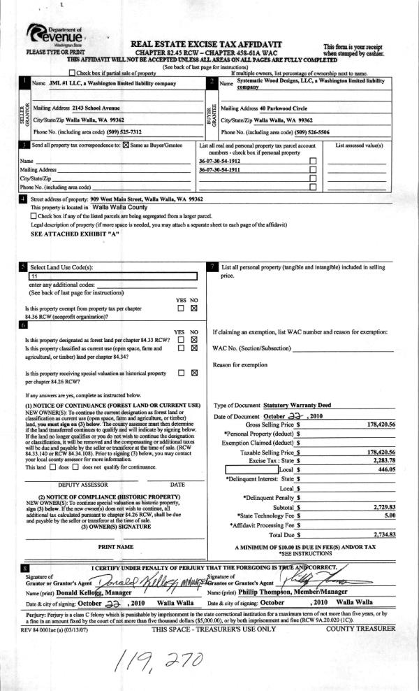 | 1 | 11/01/2010 | WARRANTY D | WARRANTY DEED | JML #1 LLC | SYSTEMATIC WOOD DESIGNS LLC | | | $178,420.00 | 119270 | 2010-08888 |